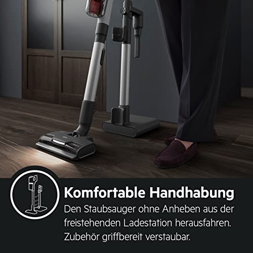 - Bedienkomfort: Roll-in/Roll-out Ladestation, freistehend – Handteil Entriegelung (vom Akku Staubsauger zum Handstaubsauger) – leicht entnehmbarer Staubbehälter (400 ml) – verstell- & abnehmbares Alu-Teleskoprohr, stufenlos anpassbar