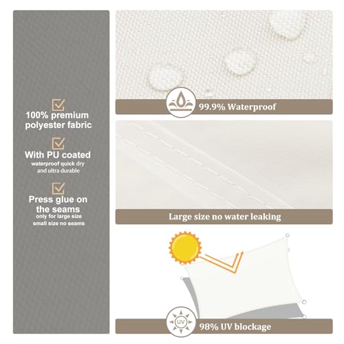 - 【Hochwertige Material】: Aus Polyestergewebe mit PU-Beschichtung (180g/㎡ PES polyester) , umweltfreundlich und leicht, wasserdicht und UV-Schutz. Freigeben von 4 Installationsseilen (jeweils 1,5 m), robuste Nähverarbeitung auf jeder Seite, Edelstahl-D-Ring an jeder Kante des , garantiert die Festigung der Installation.