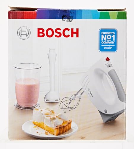 - Bosch Handrührer ErgoMixx MFQ49700, leichtes Gehäuse, Handrührgerät mit Rührbesen und Knethaken aus Edelstahl, 5 Geschwindigkeitsstufen, Pürierstab, Mixbecher, Spiralkabel, 850 Watt, weiß/schwarz