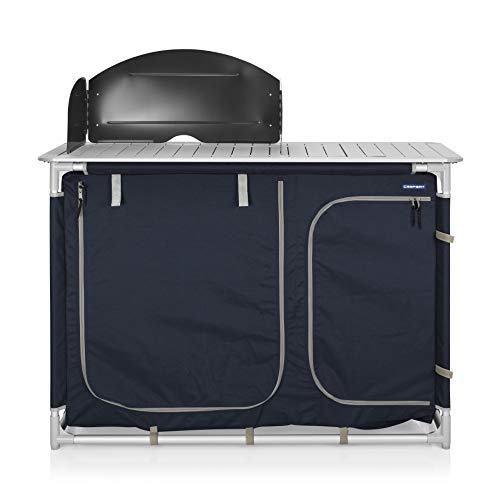 - Campart Camping-Küche Salamanca KI-0412 – Aufklappbar – mit Waschbecken – 2 Regalfächer – 4 verstellbare Füße – mit Aufbewahrungstasche – Blau
