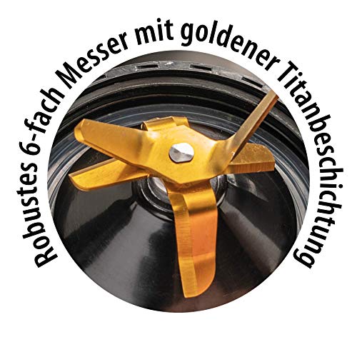 - Beste Materialien: Das robuste 6-fach Messer mit goldener Titanbeschichtung zerkleinert mühelos gefrorene Lebensmittel. Der Glasbehälter ist spülmaschinengeeignet und hat ein Volumen von 1,75 Liter.