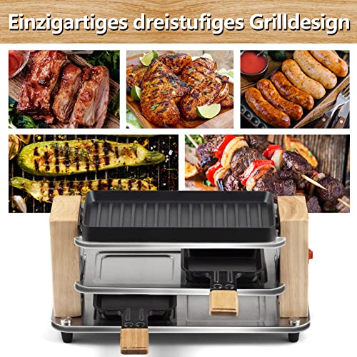 - {Praktische Ablage für Pfannen} Verfügt über eine dreistufige Grillstruktur. Wenn Sie die Raclette-Pfanne verwenden, um Ihre eigene Leckerei zuzubereiten, können Sie sie auf die dritte Schicht legen, um sie warm zu halten und ein Übergrillen zu verhindern. Kein Durcheinander auf der Arbeitsplatte.