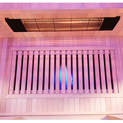 - Dewello Infrarotkabine Infrarotsauna Milton 135x105 für 1-2 Personen aus Hemlock Holz mit Vollspektrumstrahler, LED-Farblicht Sternenhimmel und Steinwand, Bluetooth, FM,MP3,USB