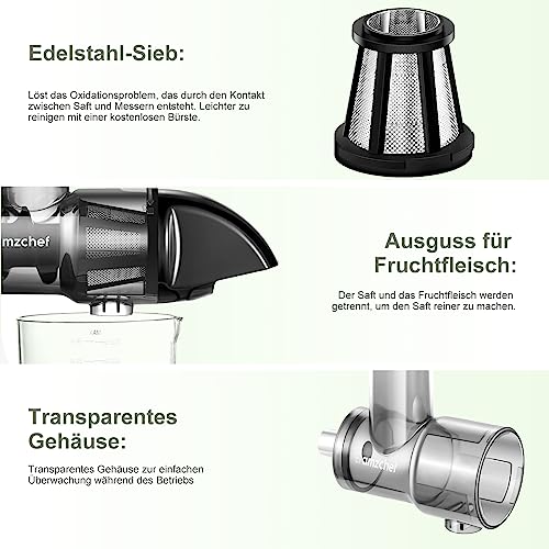 - ✔[Maximale Ausbeute an reinem Saft] - Hochgradig zerkleinernde Extraktion mit ultrahoher Saftausbeute dank der 7-stufigen Schnecke. Der hochdichte Edelstahlfilter ermöglicht eine perfekte Abtrennung des Bodensatzes und extrahiert reinen Saft in einem Schritt, so dass Sie den ursprünglichen Geschmack und das Aroma genießen können.