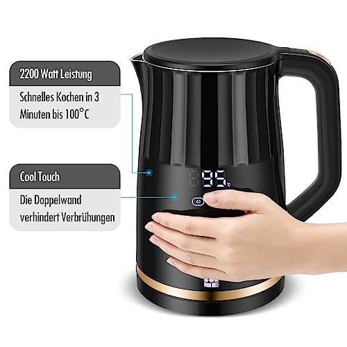 - BALTER Edelstahl Wasserkocher mit Temperatureinstellung, 45°C-100°C, Doppelwand, BPA frei, leise & kabellos, Warmhaltefunktion, Teekocher mit Temperaturanzeige, 1.5L, 2200W, Schwarz
