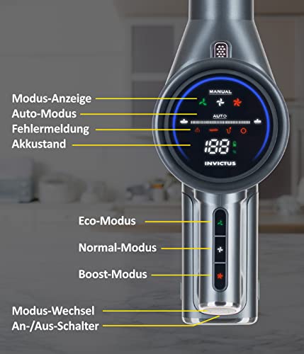 - Genius Invictus X9 Facelift Staubsauger Kabellos 19-TLG., Nass- und Trocken, Akku Staubsauger bis zu 55 Min Laufzeit Teppich Tierharre Auto Hartböden, HEPA Filter, LED, Stielstaubsauger Touchscreen