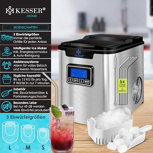 - KESSER® Eiswürfelbereiter | Eiswürfelmaschine Edelstahl | 100W Ice Maker | 12 kg 24 h | 2 Würfelgrößen | Zubereitung in 6 min | 2 Liter Wassertank | Timer | LCD-Display Wassertank Silber