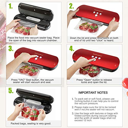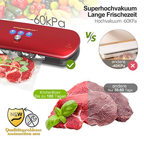 - KitchenBoss Vakumiergerät Lebensmittel Profi Vakuumierer Vacuumiergeraet:Automatisches Vaccumiermaschine Folienschweißgerät Für Trockene Lebensmitteln Inkl 5 Vakuumierbeutel Rot