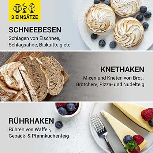 - 3 einsätze: schneebesen zum schlagen von z. b. sahne und eischnee, knethaken zum mixen und kneten von z. b. brotteig, rührhaken zum rühren von z. b. waffelteig, einsätze je nach persönlichem bedarf schnell per schnellspannsystem austauschbar