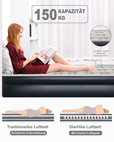 - 🔥【Der außergewöhnlichen Qualität verpflichtet】🔥Die doppelte Schicht mit der einzigartigen, nahtlos geschweißten Technologie sorgt dafür, dass das neue OlarHike Single Air Bed 48 Stunden lang ohne Austreten von Luft fest aufgeblasen bleibt, sich gut an Ihren Körper anpasst und Ihnen dabei hilft, sich vollständig zu entspannen und die ganze Nacht tief zu schlafen. Mit 35% mehr Unterstützung kann das Gästebett bis zu 150 kg tragen und ihre Form beibehalten, egal, wie lange Sie darauf schlafen.