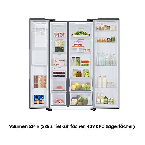 - Samsung RS6GCG885DB1EG Side by Side Kühlschrank, 178 cm, 634 ℓ Gesamtvolumen, 225 ℓ Gefrierteil, AI Energy Mode, Wasser- und Eisspender, Frischwasseranschluss, Premium Black Steel