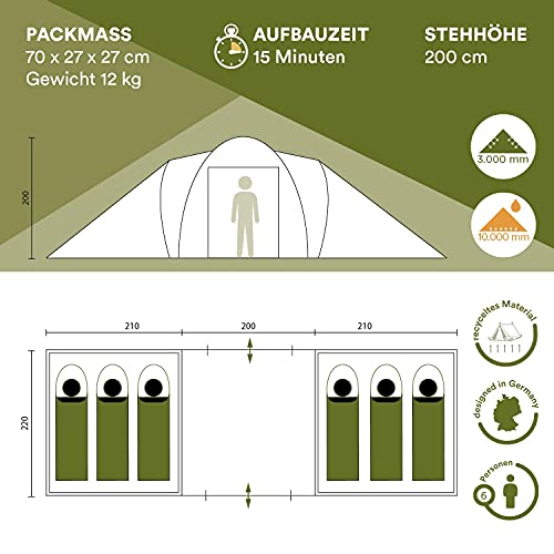 - ✔ EINGENÄHTER ZELTBODEN: Das 6-Mann Zelt mit einer bequemen Stehhöhe von 200 cm hat einen eingenähten Zeltboden und bietet so Schutz vor Insekten oder Feuchtigkeit im Innenraum.