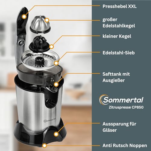 Wir haben Ihnen hier einige Informationen zum gesuchten Produkt Sommertal Saftpresse CP850 mit starkem 850W Motor, elektrische Orangenpresse inkl. 2 Presskegel, manuelle Handpresse, Zitruspresse Zitronenpresse aus Edelstahl, Juicer Entsafter, Limettenpresse zusammengetragen. Neben technischen Informationen und Produktmerkmalen finden Sie auch uns bekannte, günstige Anbieter und Angebote für diesen Artikel.