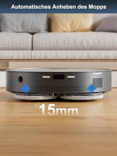 - 【Revolutionäres Rotations- und Hebesystem für Wischmop】Fairy10 Roboter Staubsauger unterscheidet zwischen Hartböden und Teppichen. Mit einer Saugleistung von 6000Pa kann es effektiv beide Oberflächen reinigen. Die doppelt rotierenden Mopps drehen sich mit 180 U/min unter 10N Druck, um Hartböden gründlich zu schrubben, während sie sich automatisch um 15mm anheben, wenn sie auf Teppiche treffen, um ein Durchnässen zu verhindern.