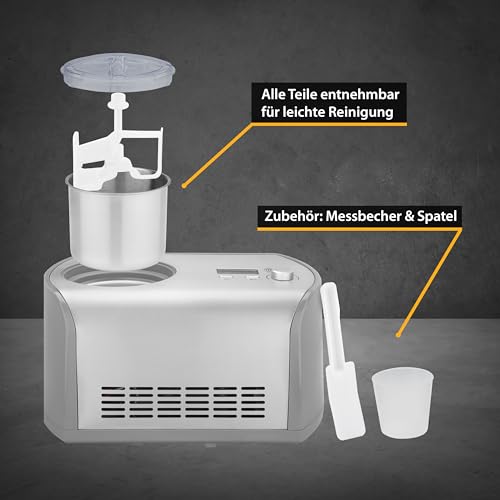 - LEICHTE BEDIENUNG - Über die Druckknöpfe und das intuitive Display können Sie flexibel die Zubereitungsdauer der Eiscreme auswählen. Ein einstellbarer Timer beendet die Eiszubereitung automatisch. Und dank der automatischen Kühlhaltefunktion, welche 10 Minuten nach Fertigstellung einsetzt, wird die Eiscreme noch einmal für 10 Minuten nachgekühlt, um ein zu schnelles schmelzen zu verhindern. Mit dem beiliegenden Messbecher und Spatel können Sie die Eiscreme portionieren.