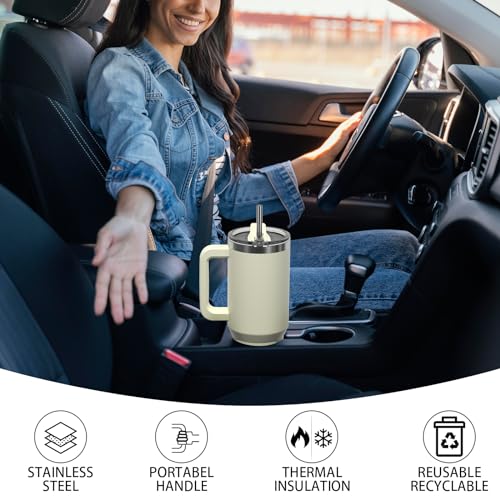 - DS One 1180ml 40oz Kaffeebecher To Go, Isolierbecher mit Griff und Strohhalm, Doppelwandiger Edelstahl, Tragbarer Autobecher, Thermobecher Kaffeetasse für Heiße und Kalte Getränke (Cremeweiß)
